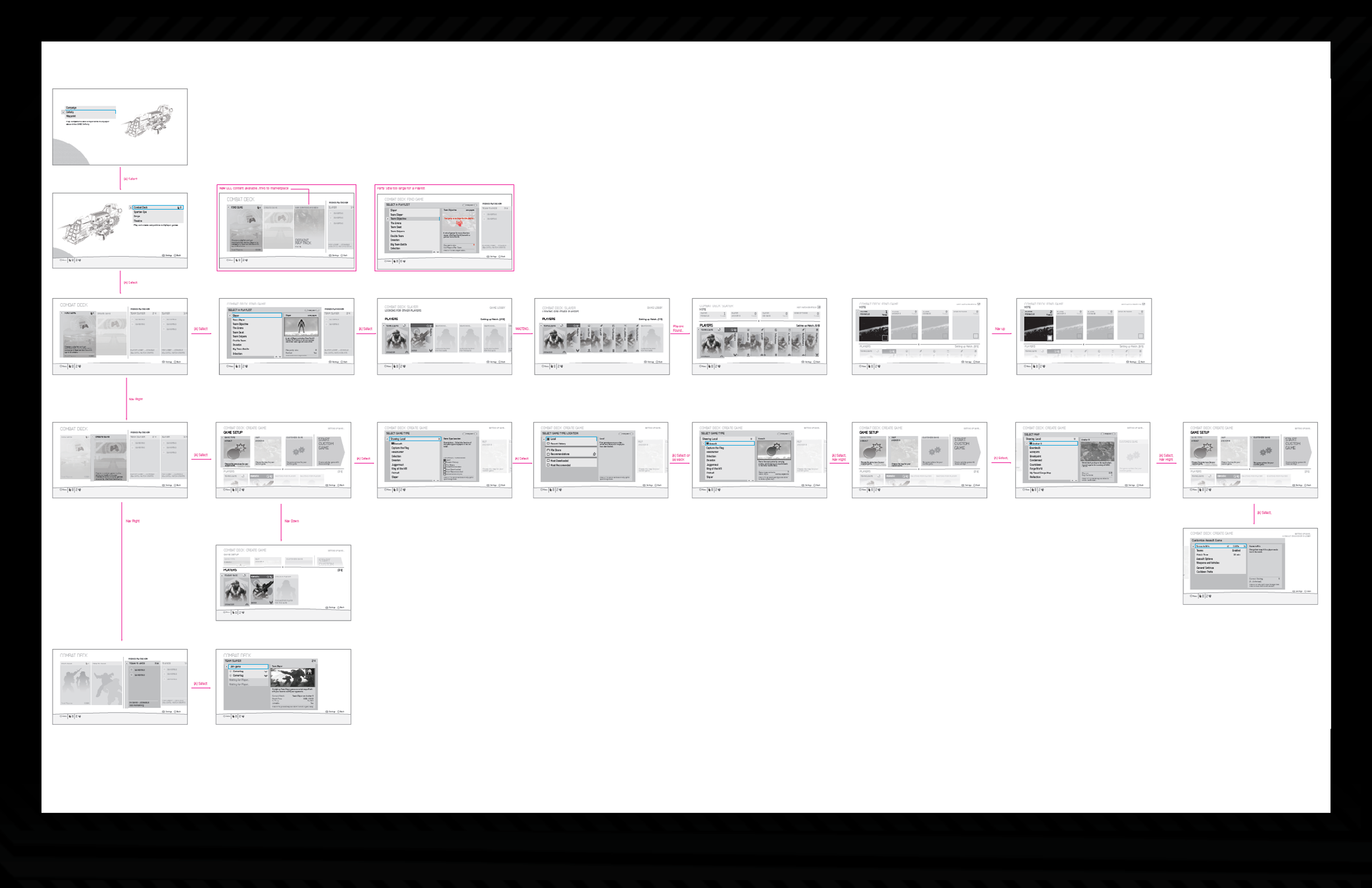 The above and below are examples of the wirefram flows I created using Adobe Illustrator. Each screen inluded all the visual/interactive elements that should be on screen, IA connection lines and interaction are between the screens.
